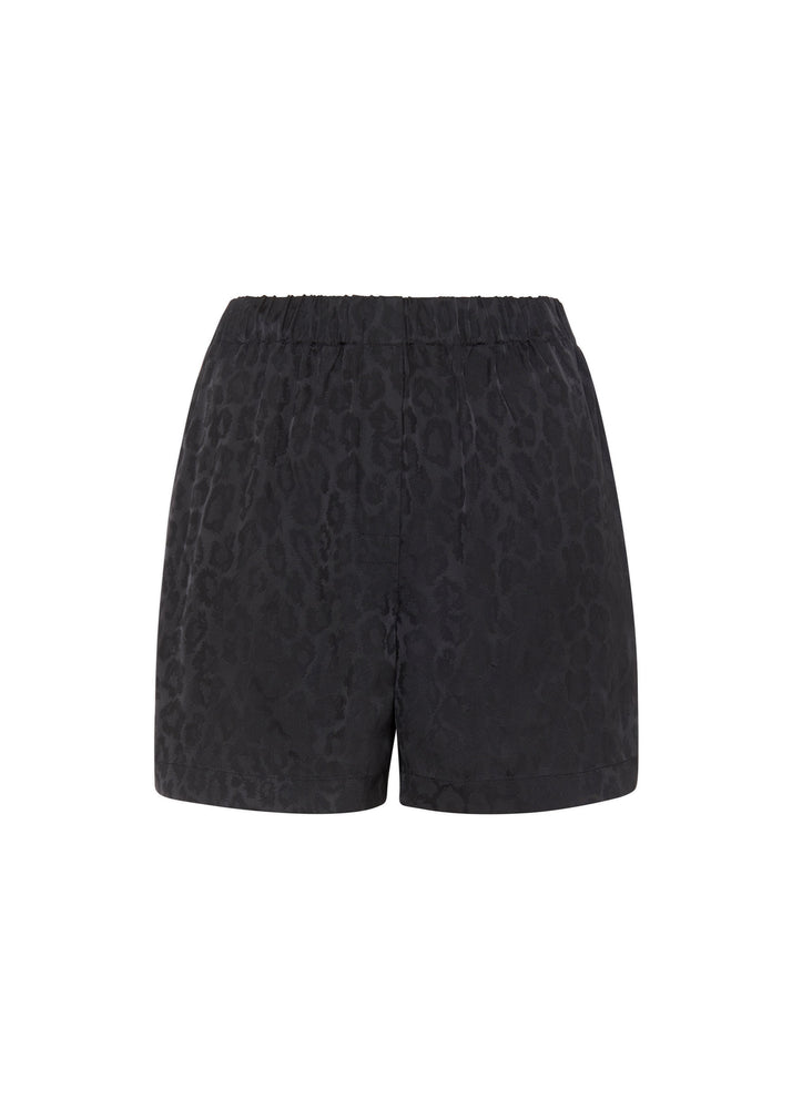 Jacquard leopard print shorts inspired by the 70s glamour and loose-fitting silhouettes of the skateboarding scene in downtown LA, as captured by Hugh Holland in his series Locals Only.