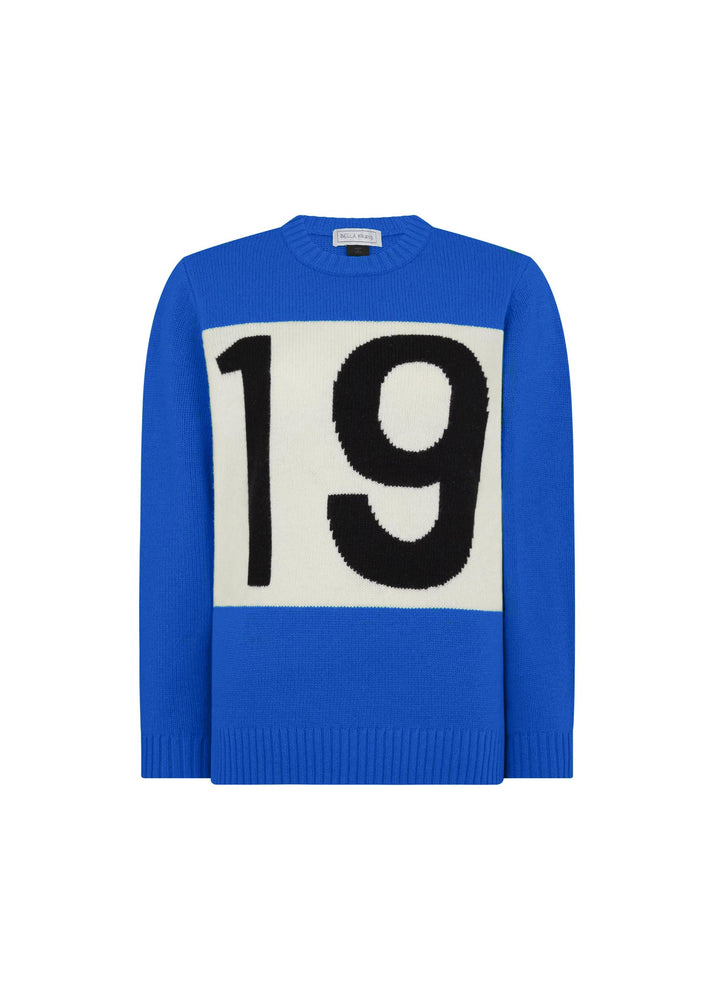 "New Era 1970 is a recasting of my most loved jumper, with a slant on the magic numbers of a favourite team player. Scaled up, the colour is bright and saturated, resonating the graphic contrast of vintage sportswear and good protest imagery. Embracing identity through one special piece. A white canvas with black writing - my favourite method."