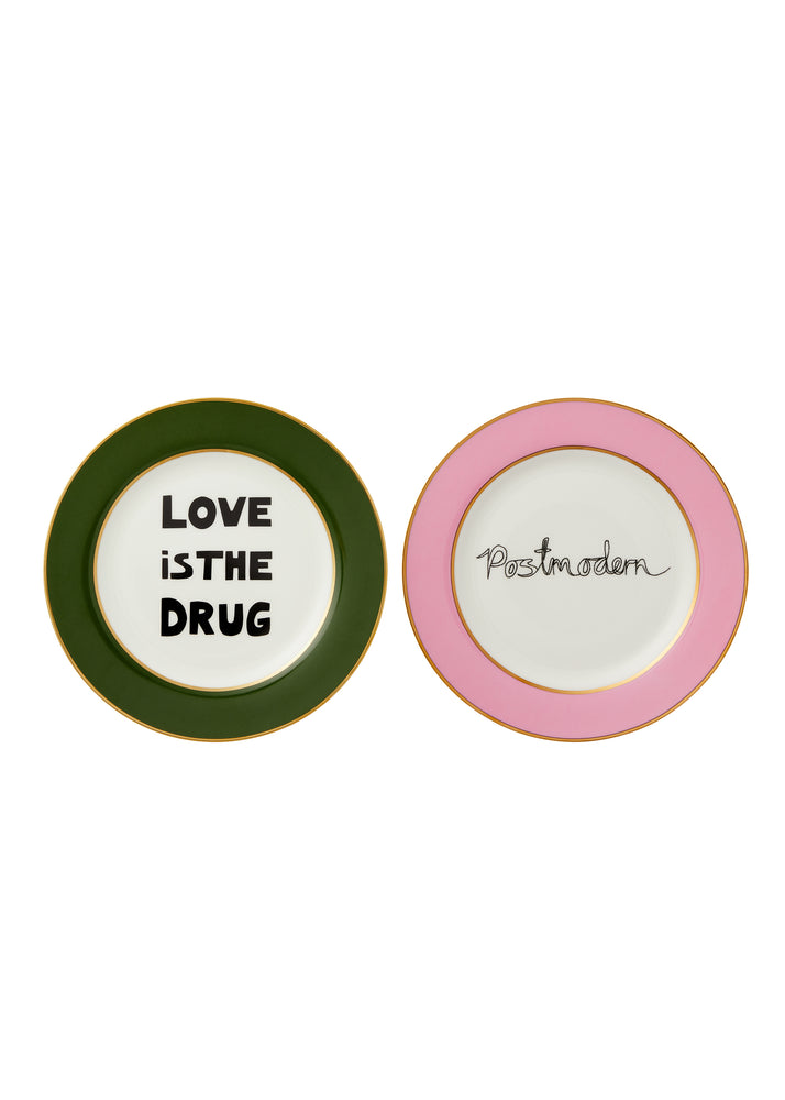 To present the food of love, serenade the heart with messages inscribed on porcelain. A set of dinner plates in 19th Century colours featuring graphics hand drawn by Bella, to build the table setting. The mood is elegantly surrealist in charming shades of olive and pale pink - both highlighted with a tiny gold stripe.
