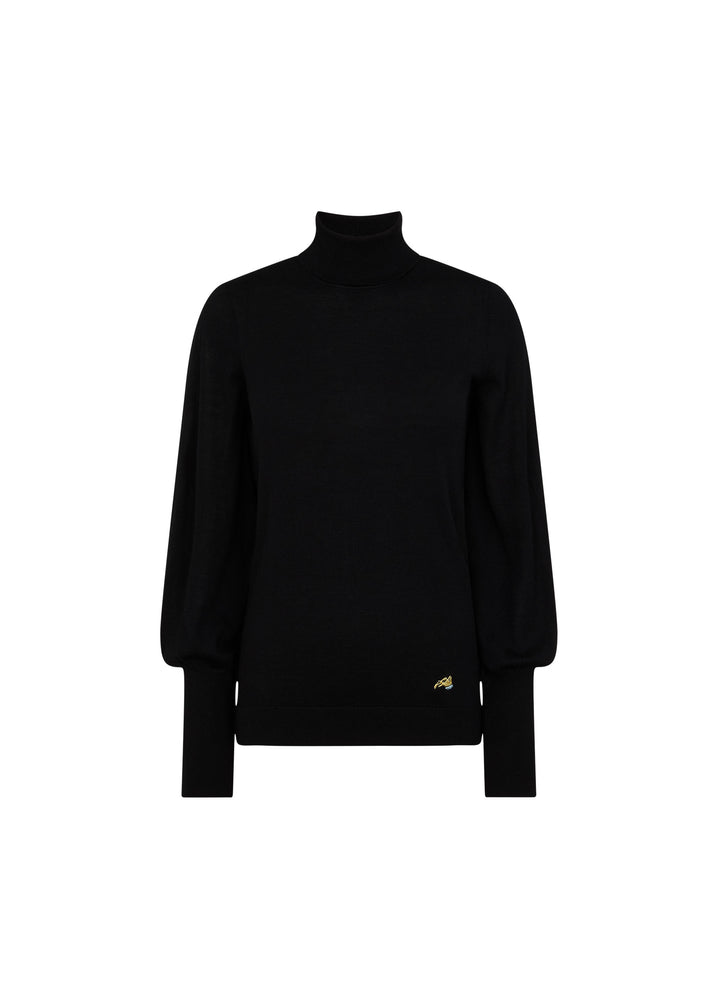 A slim, flattering fit that channels a subtle 'edge', featuring a high neck and sleeves that puff around the wrist with an exaggerated cuff.
