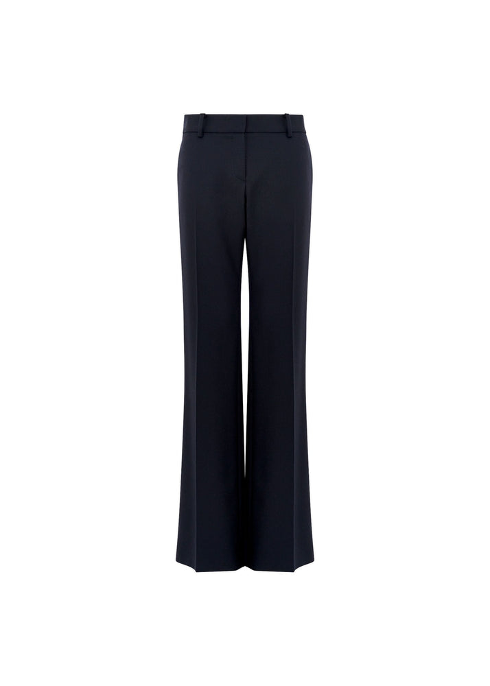Super luxe flared trouser tailored in British wool Cavalry Twill. Vertical side pockets and two back jet pockets.
