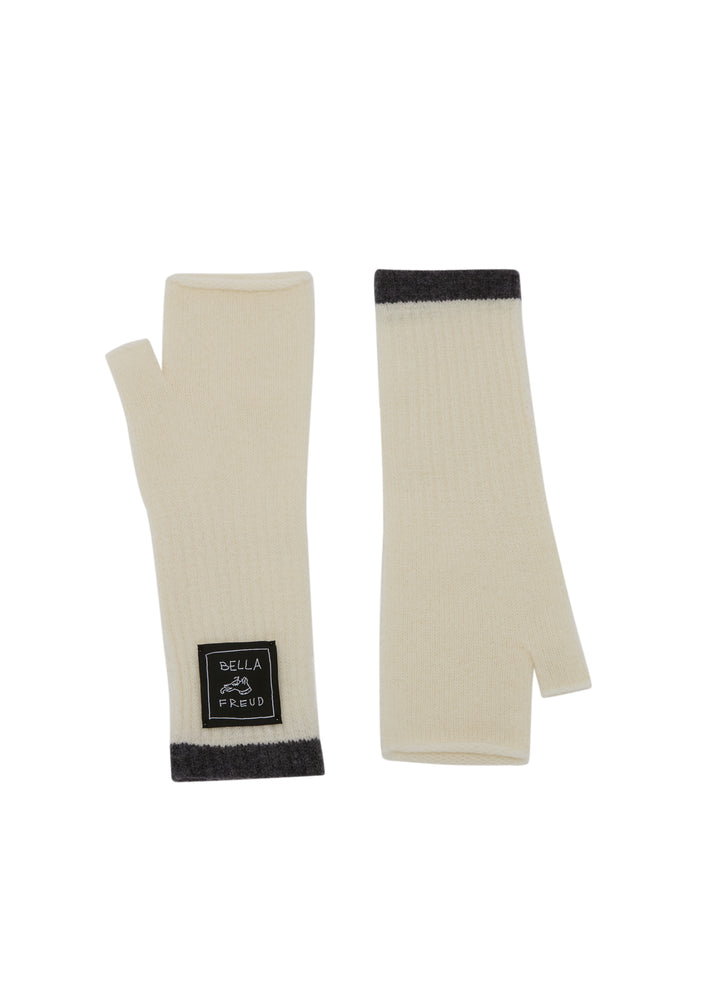 100% wool knitted wrist warmers in white, with the iconic Bella Freud logo.