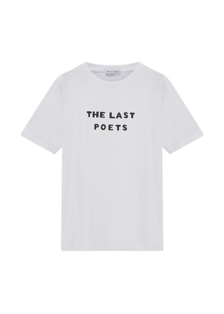 The Last Poets are a legendary ensemble of poets and jazzmen who were born out of the black civil rights movement in the 1960's. With their powerful and political lyrics and their spare rhythms, they are considered to be the godfathers of Hip Hop. Their legend and their continuing performances have established them as an enduring force in American culture. A percentage of each jumper sold goes to the Poets, I am proud to be collaborating with them. Cotton crew neck T-shirt with 'The Last Poets' print, dog embroidery on the sleeve and star on the back neck. Model is size Medium wearing a size Medium, height 6"1.5. We recommend women take a size down for a more fitted style, or your regular size for an oversized fit.