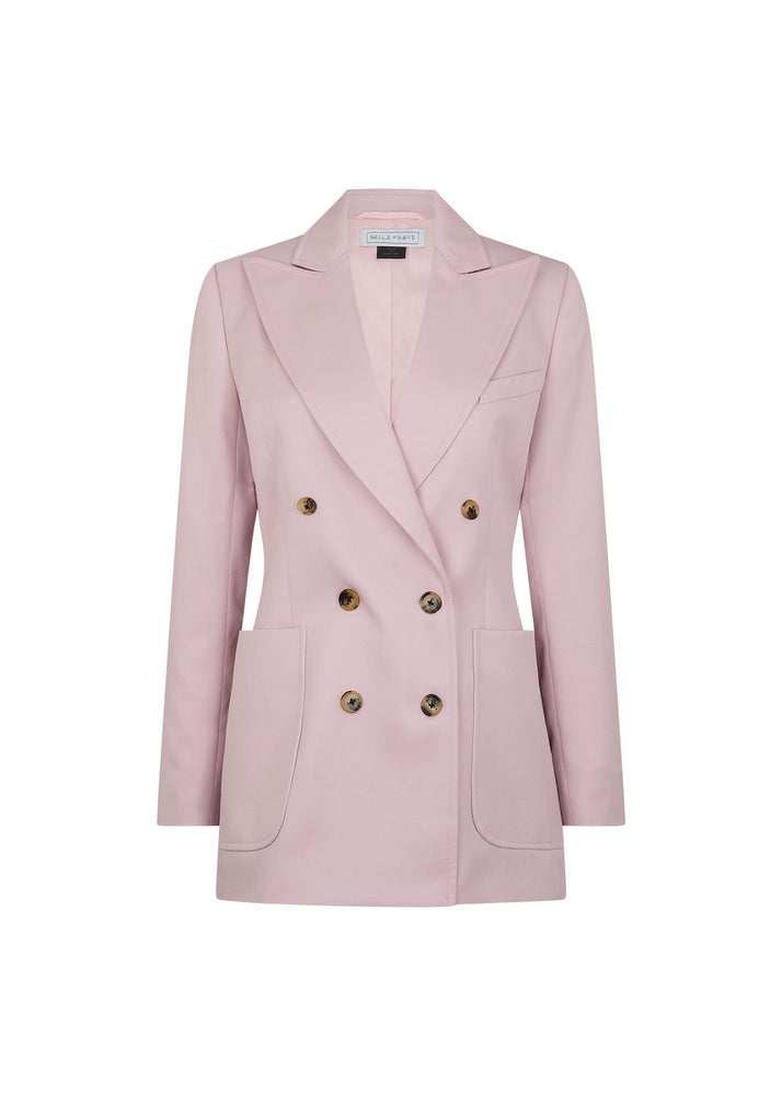 Our classic Bianca Jacket style, double breasted with a statement lapel and patch pockets. This time in a baby pink Italian lightweight cavalry twill.